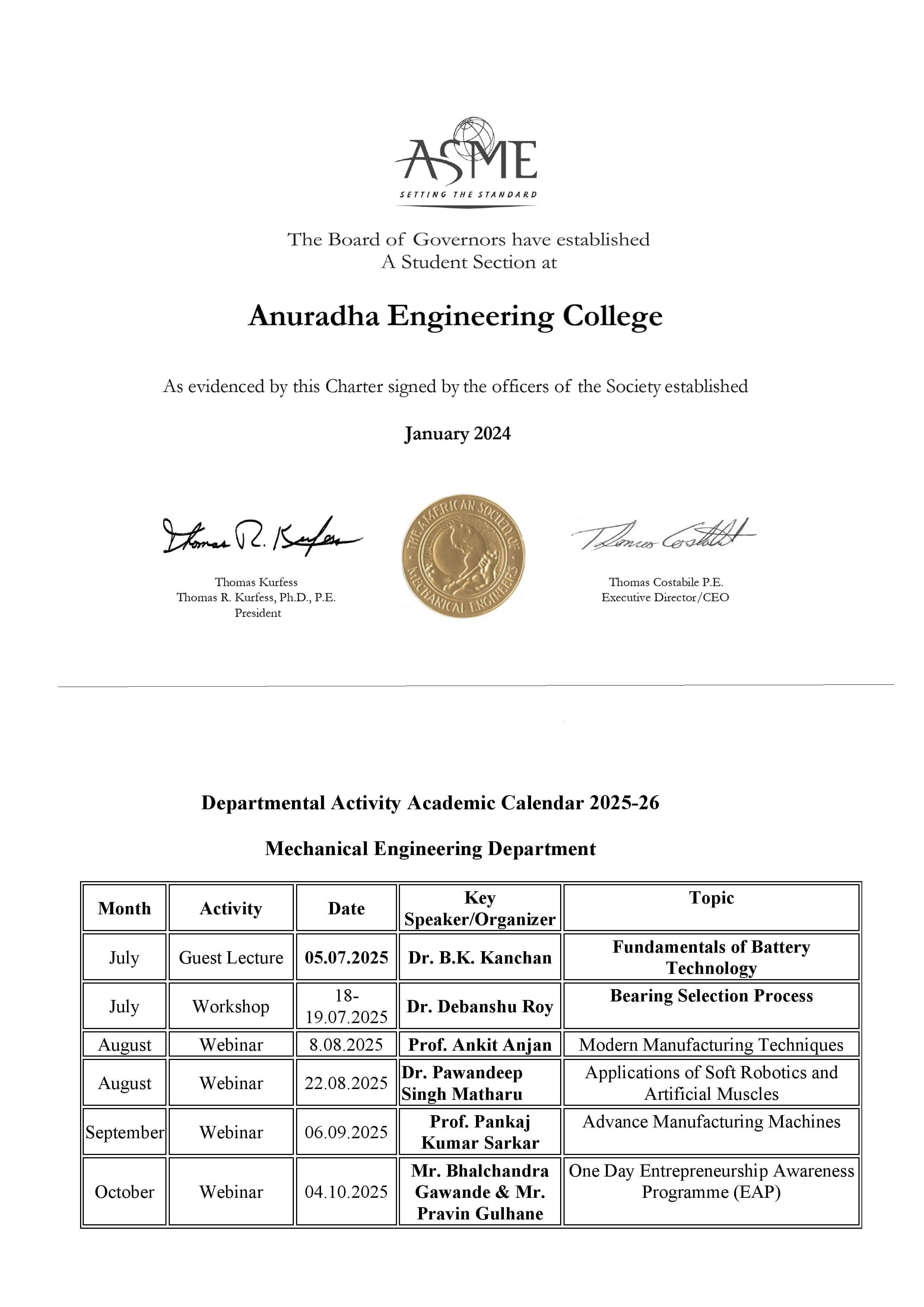 The Department conducts guiding sessions and mock tests for students to face competitive examinations like GATE, GRE etc. The Department has excellent record of in and off campus placement. In the recent years several students are pursuing higher studies in India and abroad. Good number of extra curricular activities such as Workshops, Seminars, expert lectures, and personality development programms are also organized for students for continuous update. We are abiding to produce high quality Mechanical Engineers to suit Industry, Organization and society needs.